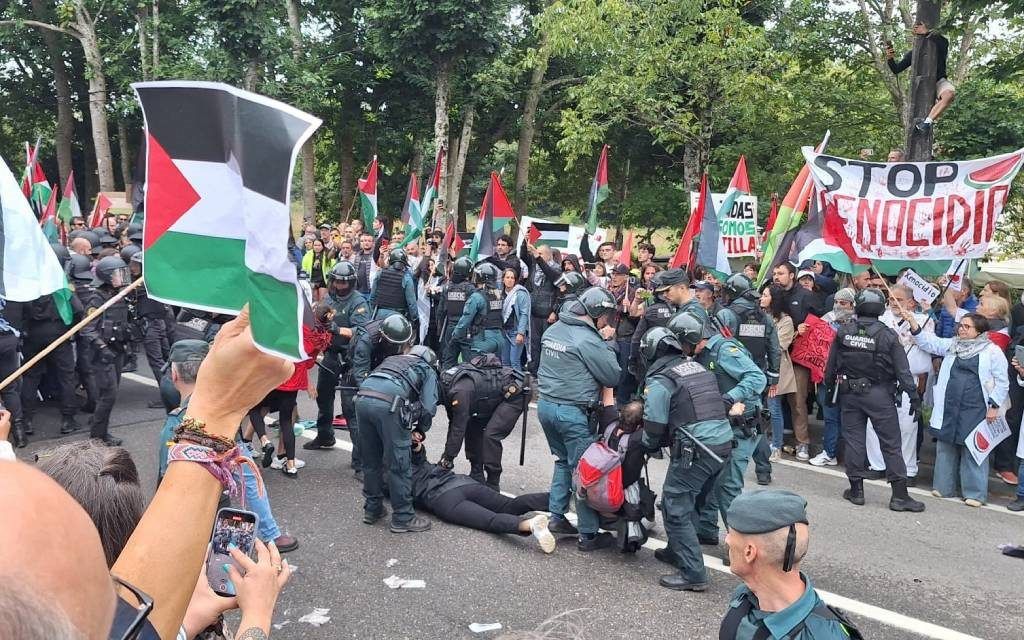 En Galicia a mobilización foi convocada pola Asociación Galiza por Palestina e a nivel estatal pola Red de Solidaridad contra la Ocupación de Palestina (RESCOP) e o movemento Boicot, Desinversión y Sanciones (BDS) O impacto destas mobilizacións foi tan decisivo que, con anterioridade a Mos, os días 3 e 5 de setembro, a etapa final da proba ciclista en Bilbao e L’Angliru (Asturias) tivo que ser suspendida pola presenza de manifestantes con bandeiras palestinas. O comezo das etapas en Galicia, ao seu paso por Vegadeo e Monforte de Lemos, deixou dez persoas detidas por manifestar.