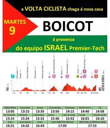 Conto todo isto porque creo que diante das inxustizas non podemos poñernos de canto nin mirar cara outro lado, porque se o facemos seremos moralmente indecentes e facilitaremos que algún día nos atinxa a barbarie. Por iso estaremos o martes 9 con bandeiras de Palestina na etapa da “Vuelta” que sae de Poio e remata en Mos, e pintaremos as cores vermella, branca, negra e verde nas estradas ao paso dese equipo financiado polo sionismo criminal, contra o xenocidio e a fin da guerra de exterminio en Gaza.