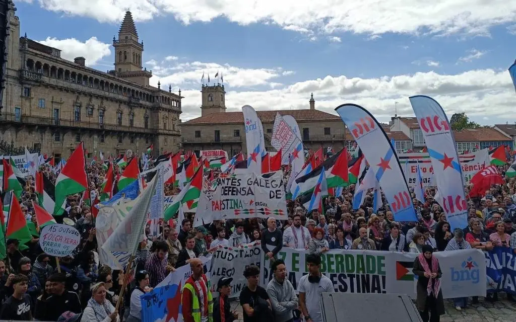 Santiago de Compostela | Baixo o lema “Galiza con Palestina. Dous anos de xenocidio, 77 de ocupación” e convocados pola Coordinadora Galega de Solidariedade con Palestina, unhas 80.000 persoas e máis de 200 entidades sociais manifestaron na Praza do Obradoiro da capital galega contra o xenocidio e a ocupación israelí de Palestina.