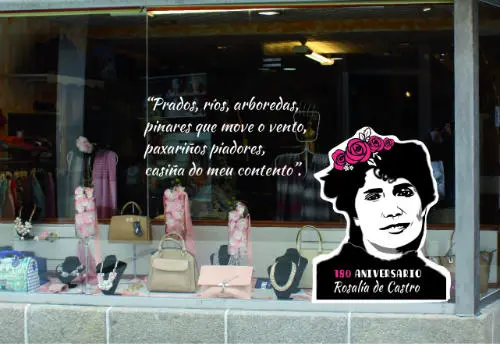 Da man de todas as empresas / comercios asociados que desexen participar, realizarase unha vistosa decoración en vinilo basada no retrato de Rosalía, xunto con algúns versos escollidos da súa obra que se colocarán no exterior de escaparates e portas. Ademáis disto, os responsables dos establecementos contan con liberdade creativa para decorar os seus escaparates e facer entre todos unha homenaxe á autora.