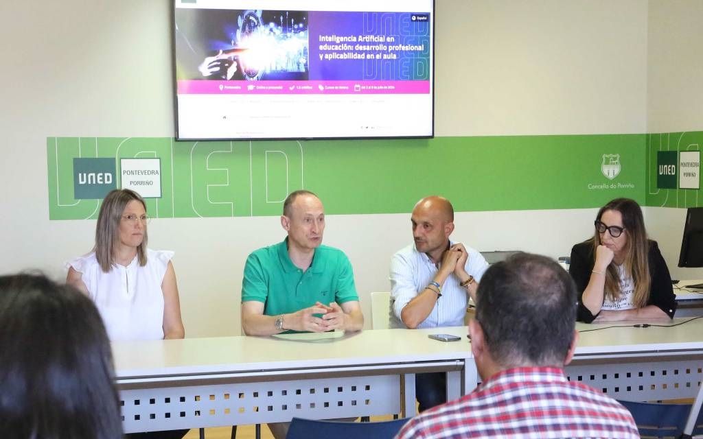 O alcalde do Porriño, Alejandro Lorenzo, e o director do Centro Asociado da UNED en Pontevedra, Victor Manuel González, inauguraron onte o curso de extensión universitaria sobre a aplicación da intelixencia artificial no eido educativo, acompañados pola directora do curso María del Mar Román e a concelleira Rosa Isabel Alonso.