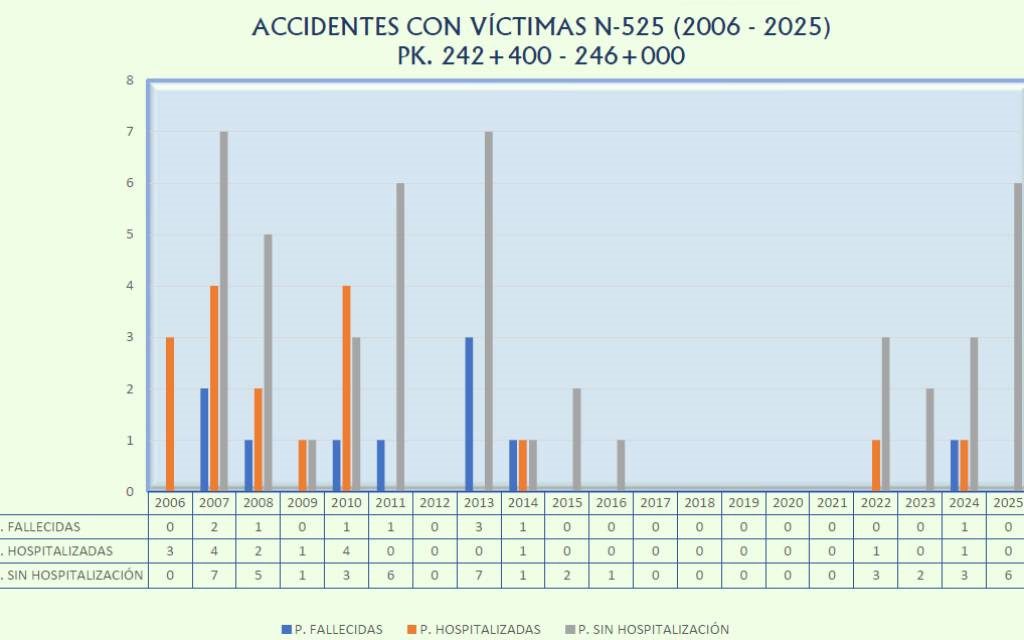 En concreto, Eladio Santos detallou que nos últimos dez anos houbo un falecido no mencionado tramo nunha colisión ocorrida en 2024 e dúas persoas feridas graves, un motorista de Tráfico en 2022 por unha colisión cun xabaril e unha condutora en 2024 por unha saída de vía. En contraposición, nos dez anos anteriores a 2015 ese tramo rexistrou 9 falecementos e 15 feridos graves, sendo considerada a zona máis perigosa da rede viaria ourensá ata a instalación do radar de tramo.