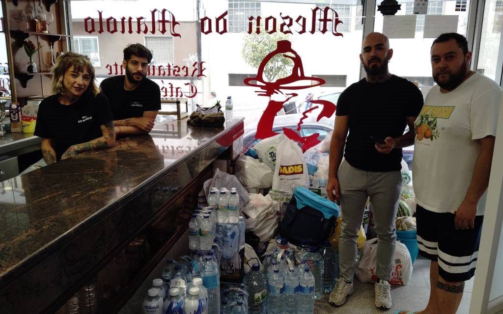 O ex brigadista Noel González González coordina o reparto que efectúan setecentos voluntarios nos seus coches e furgonetas. A Cualedro levaron una boa cantidad de agua embotellada xa que logo o Concello anunciou que a auga do subministro municipal non é potable. Ao mesón están chegaron desde o lunes día 18 paquetes enviados desde Santiago, Vigo, Lugo, A Coruña e Ourense. Na foto o coordinador das entregas Noel, co persoal do mesón do Manolo.
