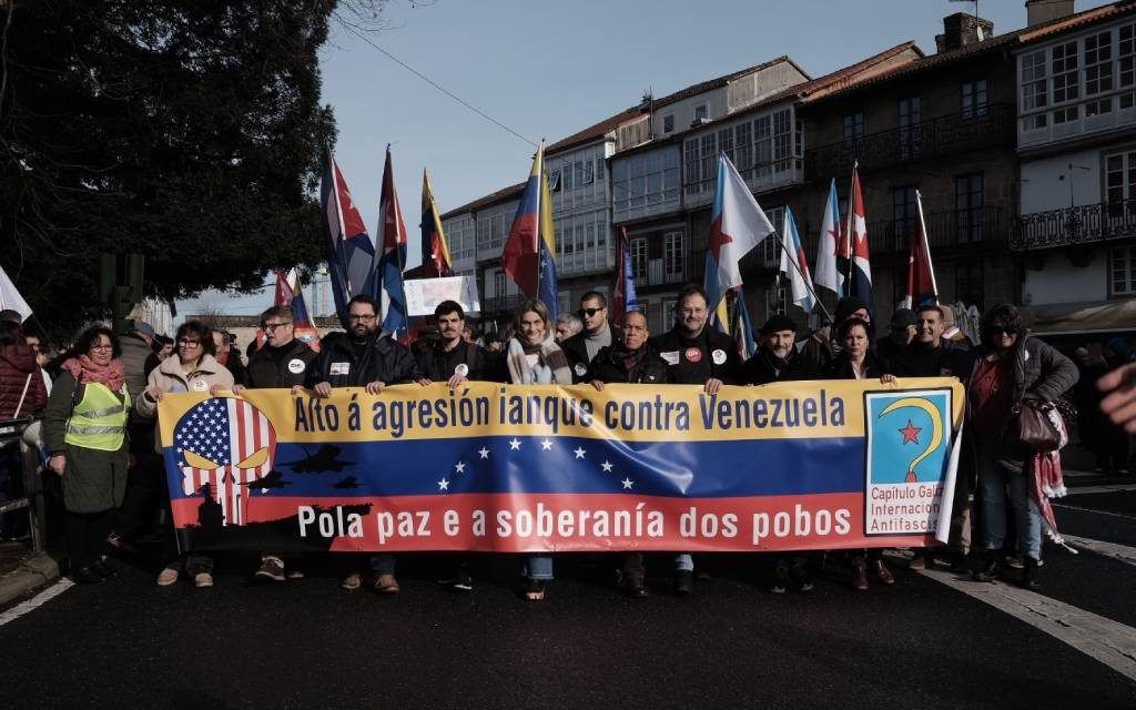 Santiago de Compostela | Aproximadamente un millar de persoas convocadas pola Asociación Galego-Bolivariana Hugo Chávez protestaron na capital galega baixo o lema “Alto á agresión ianque contra Venezuela. Pola paz e a soberanía dos pobos”, denunciando a “agresión militar imperialista sobre Venezuela” levada a cabo por parte da Administración Trump o pasado 3 de xaneiro coa captura do ex presidente Nicolás Maduro así como a vulneración do dereito internacional.